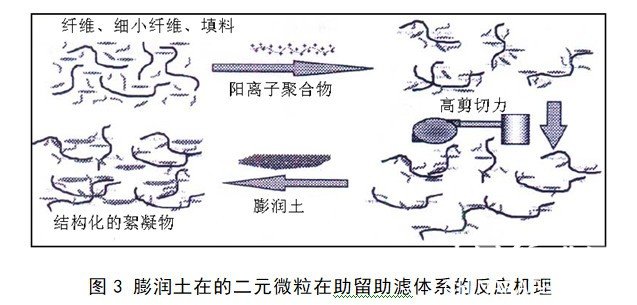 圖3顯示了簡化后的基于膨潤土的二元微粒助留助濾體系的反應機理。其中第一個成分是高分子量的陽離子高聚物,與漿料纖維直接反應,形成了很大的絮聚體,經過架橋作用和水力剪切,這些絮聚被打散,并形成新的微小絮聚體,其尺寸比原大絮聚體的十分之一還小。膨潤土在壓力篩之后添加到漿料中,微絮聚由于靜電作用力而集中在一起,形成了多孔有延展性的硬絮聚體。這種高強絮聚的結構是很難打破的,能夠高效的留著在紙頁上,最終有助于形成具有良好勻度的紙產品。