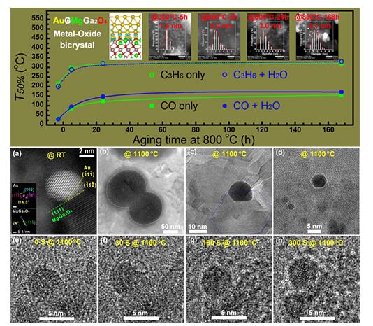 該團(tuán)隊(duì)通過前期工作發(fā)現(xiàn),由于尖晶石型氧化物的氧和貴金屬原子都是密堆積結(jié)構(gòu),鋁系尖晶石載體可以有效地穩(wěn)定晶格參數(shù)比尖晶石中氧亞晶格參數(shù)小的貴金屬及合金納米粒子(如Rh,Pd,Ir和Pt等),而不能穩(wěn)定晶格參數(shù)更大的Au和Ag(Nat. Commun., Chem. Mater., Appl. Catal. B-Environ., J. Catal.)。因此,利用氧亞晶格參數(shù)更大的MgGa2O4尖晶石載體,有望實(shí)現(xiàn)對金納米粒子的穩(wěn)定。本工作中,科研人員通過理論計(jì)算證實(shí)Au在MgGa2O4(111)面上的確較在MgAl2O4(111)面上更為穩(wěn)定;利用簡單浸漬法制備了MgGa2O4負(fù)載的尺寸約為1.5nm的金納米粒子,經(jīng)過800°C高溫焙燒5小時乃至28天后發(fā)現(xiàn),除少數(shù)金顆粒尺寸較大外,多數(shù)金顆粒都是2-3nm的小尺寸納米粒子。研究發(fā)現(xiàn),即使在1100°C高溫焙燒5小時后,約3.6nm的小尺寸金納米粒子仍穩(wěn)定存在。對該超常穩(wěn)定結(jié)構(gòu)進(jìn)行球差電鏡分析發(fā)現(xiàn),二者的接觸界面為Au(112)和MgGa2O4(111);進(jìn)一步進(jìn)行1100°C原位加熱高分辨電鏡觀察發(fā)現(xiàn),在一大顆粒金發(fā)生熔化的溫度下,小尺寸金納米粒子仍以可給出清晰晶格條紋的晶粒形式存在。熔點(diǎn)改變表明納米金晶相發(fā)生了變化,即Au-MgGa2O4長在一起形成新的晶相,科研人員將其命名為金屬-氧化物“異質(zhì)孿晶”,并以“”符號指代這一不同于常規(guī)負(fù)載型結(jié)構(gòu)的特殊“growing on”結(jié)構(gòu)。通過測定單位質(zhì)量金的熔化熱,可知1100°C焙燒后仍有80%以上的金以異質(zhì)孿晶結(jié)構(gòu)存在。該AuMgGa2O4催化劑具有負(fù)載型納米金催化劑的尺寸效應(yīng)和載體效應(yīng),經(jīng)800°C老化后,仍保持納米金的高催化活性,催化CO和丙烯燃燒的起燃溫度分別約為150°C和300°C,有望作為活性組分用于柴油發(fā)動機(jī)尾氣氧化催化劑,解決冷啟動期間鉑族金屬低溫消除CO不力的問題。