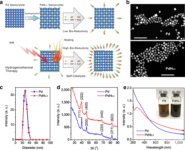 PdH0.2納米晶的合成方法和氫熱療法的工作原理示意圖。b. STEM照片(比例尺:100納米)。c. DLS數(shù)據(jù)。d. XRD圖譜。 e. UV-VIS-NIR吸收光譜。