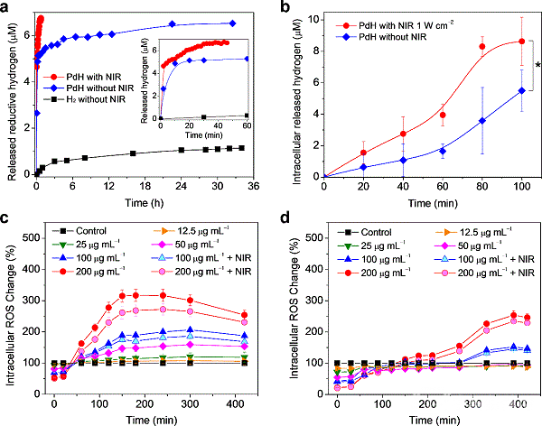 a, b是PdH0.2在模擬體液中(a)和HeLa細(xì)胞中(b)的釋氫行為,其使用亞甲基藍(lán)(MB)作為活性氫的探針進(jìn)行檢測(cè)。c, d是表示PdH0.2對(duì)HeLa腫瘤細(xì)胞(c)和HEK-293T正常細(xì)胞(d)細(xì)胞內(nèi)ROS水平的影響。