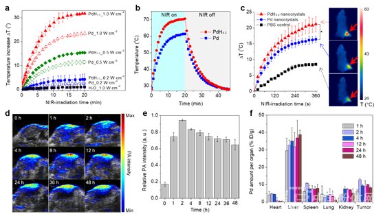 PdH0.2和Pd納米晶的光熱效應(yīng)。b. 光熱轉(zhuǎn)化效率效率評(píng)價(jià)。c. 靜脈注射PdH0.2后4T1荷瘤小鼠的腫瘤光熱成像。d,e. 4T1腫瘤光聲成像。f. ICP定量體內(nèi)分布。