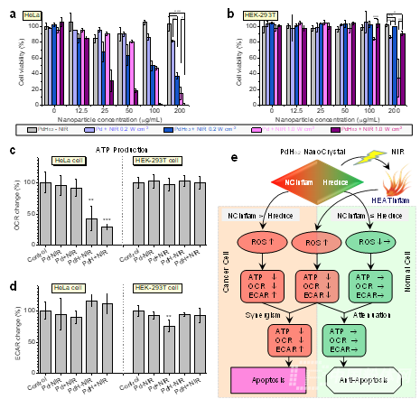 a,b氫熱療法的體外抗癌效果。c,d. 細(xì)胞能量代謝行為。e. 氫熱腫瘤治療的機(jī)制圖。