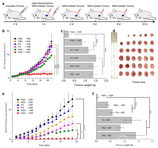 腫瘤小鼠的氫熱治療方法。b,c,d. 對(duì)4T1腫瘤的治療效果。e,f. 對(duì)B16-F10腫瘤的治療效果。