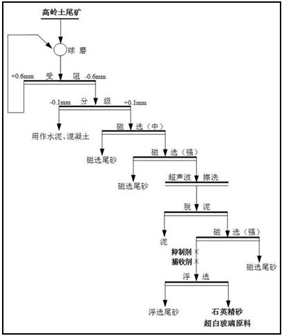 本發(fā)明涉及一種超白玻璃用原料的制備方法,其特征在于包括以下步驟:a.高嶺土尾礦經(jīng)球磨、篩分、分級(jí),脫除泥質(zhì)膠結(jié)物,b.隨后經(jīng)多段磁選工藝,去除含鐵雜質(zhì)礦物;c.磁選后精砂經(jīng)超聲波擦洗、脫泥;d.脫泥后精砂用強(qiáng)磁選處理,去除脫落的鐵泥;e.強(qiáng)磁選后精砂經(jīng)中性正浮選,使石英砂與氧化鐵浸染型石英砂、含鐵鋁硅酸鹽礦物有效分離。本發(fā)明的有益效果:1.提高了高嶺土尾礦綜合利用價(jià)值,使石英砂產(chǎn)品附加值增加;2.制得一種超白玻璃用原料且工藝流程簡(jiǎn)單,能耗低;3.中性浮選藥劑廢水,易處理達(dá)標(biāo)排放。
