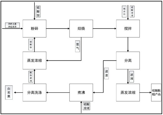 本發(fā)明涉及一種由高嶺土基高硅廢渣生產(chǎn)白炭黑的制備方法,包括以下步驟的方法:首先將高硅廢渣與助劑按一定比例混合研磨至過(guò)200目,以一定的溫度在馬弗爐中煅燒,冷卻至室溫;向煅燒后的粉料中加入一定量硫酸溶液和少量絡(luò)合劑,混合攪拌一段時(shí)間后過(guò)濾,濾液蒸發(fā)濃縮后得到硫酸鈦粗產(chǎn)品;將濾渣與一定量硫酸溶液混合煮沸一定時(shí)間后過(guò)濾,洗滌至中性,烘干即得白炭黑產(chǎn)品。本發(fā)明利用高嶺土基高硅廢渣作為硅源,實(shí)現(xiàn)變廢為寶,更具有經(jīng)濟(jì)意義和環(huán)保價(jià)值,而且工藝簡(jiǎn)單,固定資產(chǎn)投資少、原料來(lái)源廣、生產(chǎn)成本低、無(wú)三廢排放。