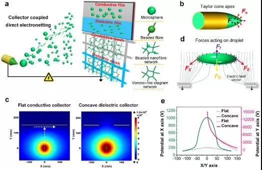 (圖1 二維納米蛛網(wǎng)材料的設(shè)計(jì)與開發(fā)(a)靜電噴網(wǎng)技術(shù)示意圖,(b)泰勒錐尖端受力分析,(c)接收器耦合誘導(dǎo)電場分布,(d)荷電液滴微電場形變,(e)電勢vs位置分布曲線)