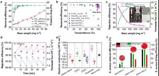 其中,超薄PVDF納米蛛網(wǎng)高透光材料(透光性>95%)可有效過濾空氣中超細(xì)顆粒物PM0.3,過濾效率達(dá)99.86%,空氣阻力僅~30 Pa。PAN納米蛛網(wǎng)材料因具有超親水且快速滲透特性,與常規(guī)液體過濾材料相比,在具有相同過濾效率(99.92%)時(shí),滲透通量提高了一個(gè)數(shù)量級(jí)(3550±275 L m-2 h-1)。此外,經(jīng)碳化或煅燒處理后獲得的碳基與TiO2基納米蛛網(wǎng)材料,也分別展現(xiàn)出優(yōu)異的導(dǎo)電性能與生物防護(hù)特性。