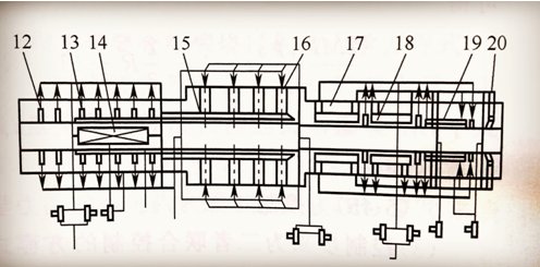 12.排濕孔;13.煙氣排出孔;14.換熱器;15.隔煙道;16.燃燒室;17.間接急冷;18.間接冷卻;19.金屬管冷卻;20.直接冷風(fēng)送入