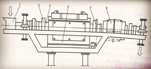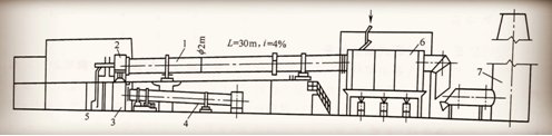 1.回轉(zhuǎn)窯窯體;2.窯頭小車;3.熱煙室;4.冷卻筒;5.窯頭鼓風(fēng)機(jī);6.集塵室;7.煙囪