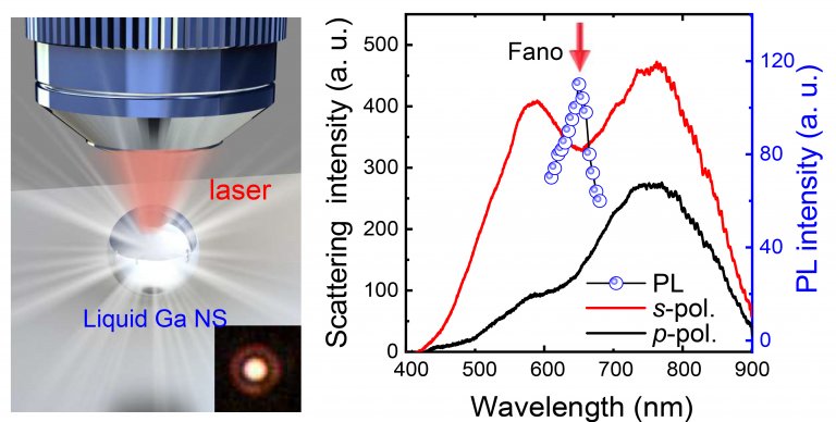 華南師范大學(xué)信息光電子科技學(xué)院蘭勝教授研究小組首次報(bào)道了利用飛秒激光燒蝕制備直徑范圍為50至300 nm的球形鎵納米顆粒的方法。他們發(fā)現(xiàn)制備的鎵納米球由液態(tài)鎵核和固態(tài)二三氧化二鎵殼組成,呈現(xiàn)出跨越紫外到近紅外光譜區(qū)的表面等離子體共振。在飛秒激光的激發(fā)下,放置在玻璃上的鎵納米球僅觀察到二次諧波。形成鮮明對比的是,當(dāng)將這些鎵納米球放置在薄銀膜上時(shí),在飛秒激光激發(fā)下可以產(chǎn)生顯著的白光輻射。通過數(shù)值模擬發(fā)現(xiàn)在鎵納米球的后向散射光譜中形成了源自鏡像誘導(dǎo)的磁偶極共振和間隙等離子體模式之間干涉的Fano共振。通過共振激勵(lì)磁偶極共振或Fano共振,可以實(shí)現(xiàn)有效的白光發(fā)射。通過對鎵納米球的發(fā)光強(qiáng)與激發(fā)強(qiáng)度的依賴進(jìn)行分析,鎵納米球的發(fā)射的白光屬于熱電子帶內(nèi)熒光。實(shí)驗(yàn)觀察結(jié)果與基于液態(tài)鎵復(fù)折射率的數(shù)值模擬結(jié)果非常一致。