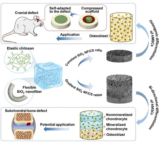 同時(shí),研究人員進(jìn)一步通過控制不同區(qū)域納米纖維與殼聚糖的比例,構(gòu)建了從有機(jī)到無機(jī)、從柔軟到堅(jiān)硬的梯度纖維支架,在軟組織與骨界面處的骨缺損修復(fù)中展現(xiàn)出巨大的應(yīng)用潛力。