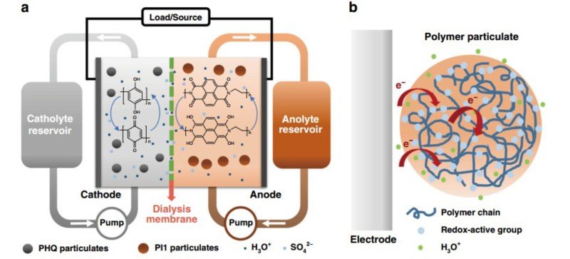 圖1. 聚合物微粒“泥漿”電池的原理示意圖。