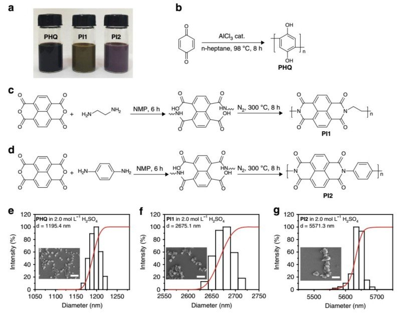為了解決上面的問(wèn)題,金鐘課題組設(shè)計(jì)了一種水系分散的聚合物微!澳酀{”電池。該聚合物泥漿電池采用可以發(fā)生多電子氧化還原反應(yīng)、易于制備的聚對(duì)苯二酚和聚酰亞胺分別作為電池的正極和負(fù)極活性材料,將聚合物制成微粒,均勻分散在酸性水溶液中(圖2)。高濃度的聚合物微!澳酀{”打破了聚合物在水相溶液中的溶解限制,有效地拓寬了不溶性氧化還原可逆物質(zhì)在液流電池中的應(yīng)用。