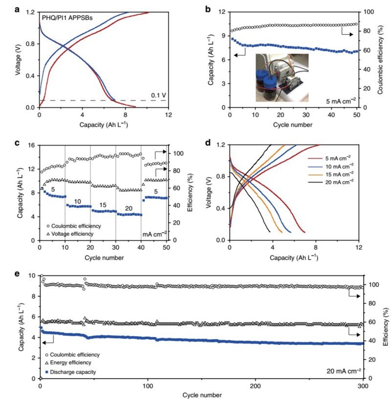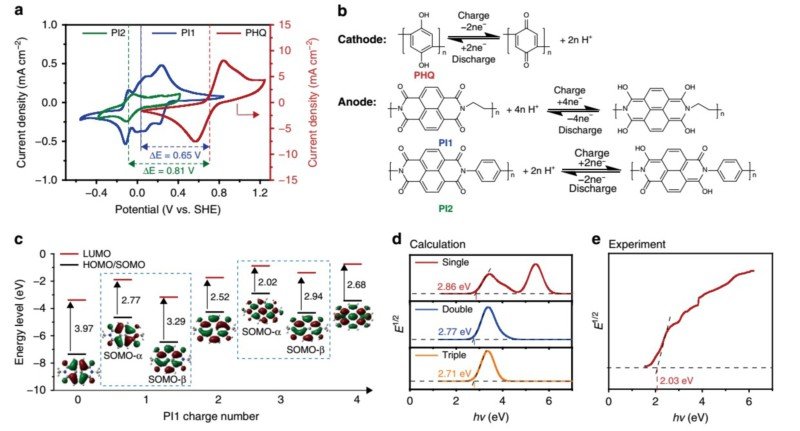 電化學(xué)分析測(cè)試表明聚對(duì)苯二酚和聚酰亞胺微粒能進(jìn)行多電子的電化學(xué)氧化還原可逆反應(yīng),且擴(kuò)散系數(shù)和電子轉(zhuǎn)移速率常數(shù)與其他可溶性有機(jī)物相當(dāng)(圖3)。通過(guò)兩種聚酰亞胺的對(duì)比,研究了官能團(tuán)調(diào)控對(duì)于有機(jī)化合物電化學(xué)性能的影響,驗(yàn)證了有機(jī)電化學(xué)活性物質(zhì)的結(jié)構(gòu)多樣性特點(diǎn)在液流電池應(yīng)用中的優(yōu)勢(shì)。