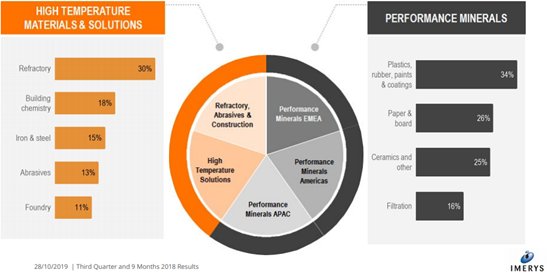 2019公司圍繞核心市場(chǎng),分兩個(gè)分部進(jìn)行組織:性能礦物以及高溫材料和解決方案。其中性能礦物細(xì)分市場(chǎng)匯集了三個(gè)地理業(yè)務(wù)領(lǐng)域:歐洲、中東、非洲(EMEA)、美洲和亞太(APAC),服務(wù)于塑料、油漆和涂料、過(guò)濾、陶瓷、可再生能源以及紙張和紙板市場(chǎng)。性能礦物包括性能添加劑、過(guò)濾、碳酸鹽、陶瓷、高嶺土、石墨和碳部門,以及膨潤(rùn)土和珍珠巖中間業(yè)務(wù)部門。