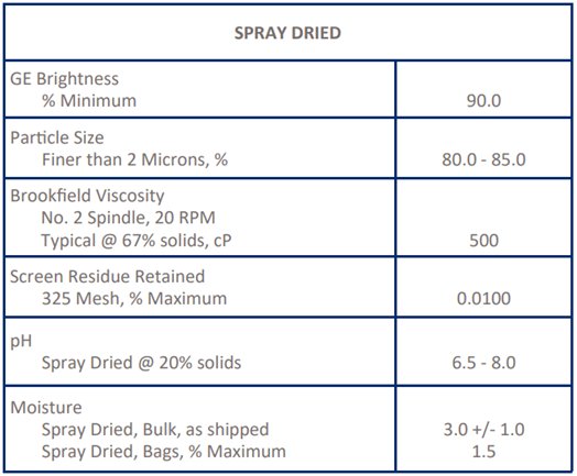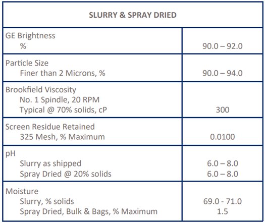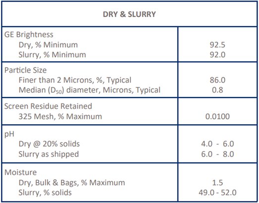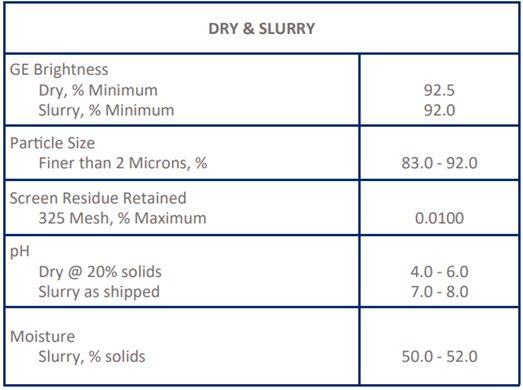 Thiele的部分高嶺土產(chǎn)品規(guī)格