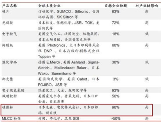 據(jù)SEMI、公司公告等,2018年日韓在半導(dǎo)體原材料產(chǎn)業(yè)鏈?zhǔn)袌?chǎng)份額較高的具體產(chǎn)品包括:硅片(63%)、光刻膠(72%)、掩膜版(60%)、電子級(jí)氫氟酸(93%)、濺射靶材(50%)、硅微粉(90%)、MLCC粉體(>50%)。