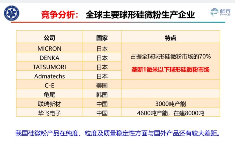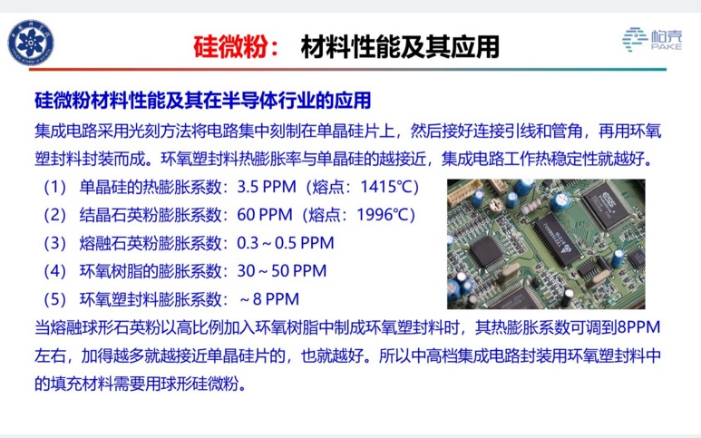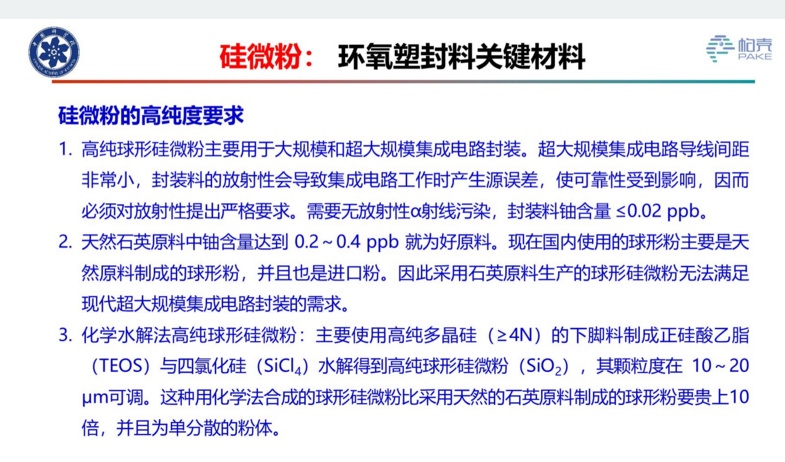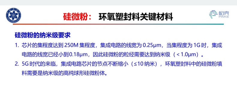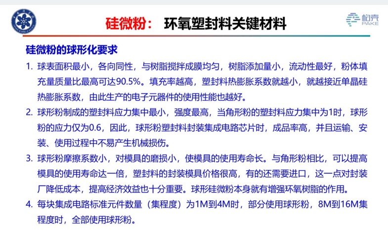 第二部分李豐研究員介紹了環(huán)氧塑封料中的關(guān)鍵材料——硅微粉。然后介紹了半導(dǎo)體集成電路芯片封裝的市場需求:全球集成電路封裝行業(yè)中的97%采用環(huán)氧塑封作為外殼材料;然后對硅微粉的球形化、高純度要求、納米級要求,中國硅微粉技術(shù)與市場進(jìn)行細(xì)致講解。