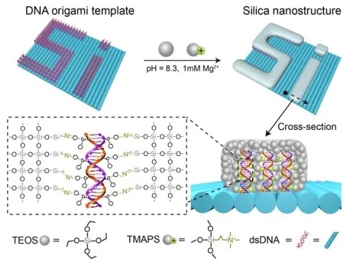 DNA自組裝結(jié)構(gòu)引導(dǎo)的二氧化硅納米結(jié)構(gòu)位點(diǎn)可控合成示意圖
