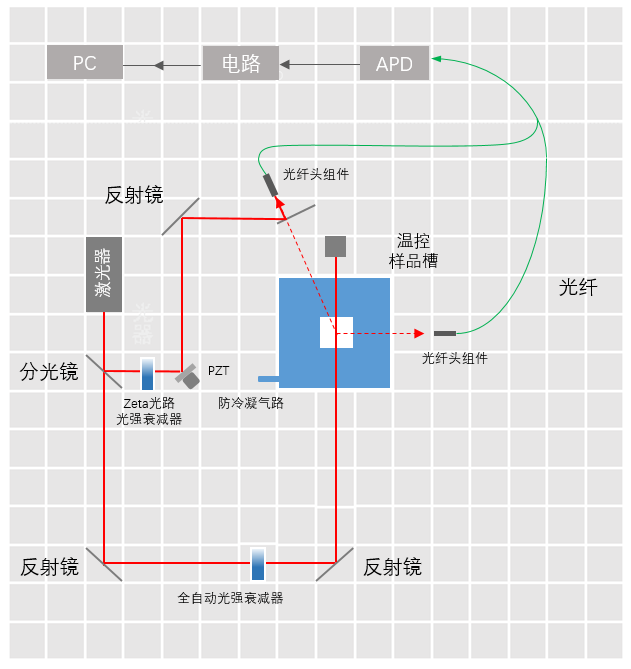 電泳光散射ELS技術(shù)是一種光學(xué)的測試技術(shù),通過檢測顆粒電泳運(yùn)動產(chǎn)生的散射光的多普勒頻移,進(jìn)而分析原始的光學(xué)信號得到顆粒的電泳速度信息,由亨利方程建立的顆粒電泳速度和Zeta電位的關(guān)系最終得到顆粒在當(dāng)前體系中ZETA電位ζ和ZETA電位分布信息。