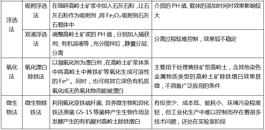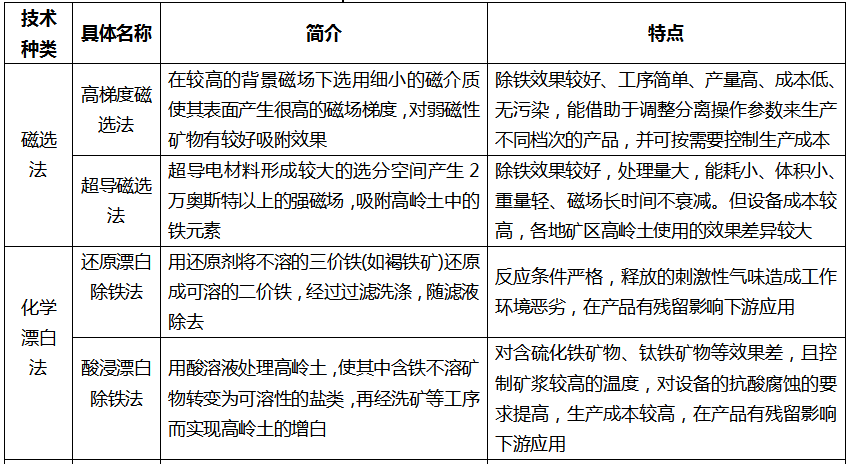 白度是高嶺土產(chǎn)品最重要的指標(biāo),鐵含量越高的礦產(chǎn)品燒成白度就越低,發(fā)展除鐵技術(shù),提高高嶺土產(chǎn)品白度成為行業(yè)的必然發(fā)展趨勢(shì)。除鐵技術(shù)包括磁選法、化學(xué)漂白法、浮選法、氧化法、微生物法等多種技術(shù)。其中,磁選法是除鐵技術(shù)最主要發(fā)展方向,鐵元素在高嶺土中主要有多種形式存在,各個(gè)礦區(qū)高嶺土原礦中鐵元素的存在形式差異較大,在實(shí)際除鐵過(guò)程中,需要針對(duì)不同情況制定具有針對(duì)性除鐵方案,才能提高除鐵效果。磁選除鐵已經(jīng)發(fā)展出高梯度磁選、超導(dǎo)磁選等技術(shù)。