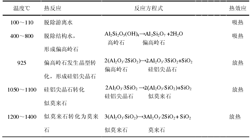 高嶺土在加熱過(guò)程中會(huì)發(fā)生脫水、分解、析出新物相等物化變化,較為復(fù)雜,一般認(rèn)為,高嶺土在加熱過(guò)程主要包括兩個(gè)階段:脫水階段和脫水后產(chǎn)物的轉(zhuǎn)化階段。