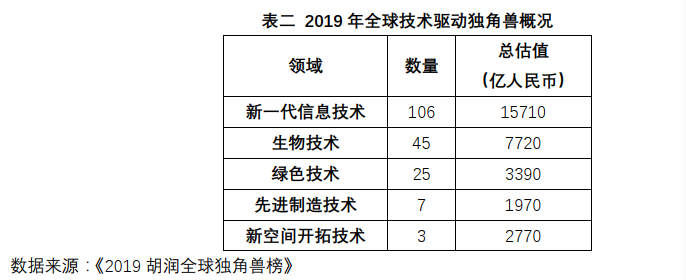 當前新一輪科技革命和產業(yè)變革正處在實現(xiàn)重大突破的歷史關口,全球科技創(chuàng)新進入空前密集活躍的時期,前沿技術呈現(xiàn)集中突破態(tài)勢,多個技術群相互支撐,全面涌現(xiàn)的鏈式發(fā)展局面正在形成。眾多顛覆性創(chuàng)新呈現(xiàn)幾何級滲透擴散,引領戰(zhàn)略性新興產業(yè)眾多領域實現(xiàn)加速發(fā)展,并以革命性方式對傳統(tǒng)產業(yè)產生全面沖擊。中國科學院白春禮院士將當前的主要技術進展歸納為信息科技、生命健康、能源、新材料、先進制造、深空深海深地探測六個方面。而從具體產業(yè)發(fā)展的角度,全球獨角獸企業(yè)可以視為一個觀察新產業(yè)、新技術突破的窗口。在所有以技術創(chuàng)新為主要驅動力的獨角獸企業(yè)中,明顯具有主導驅動力,并將在下一步發(fā)展中可以起主要作用的技術群主要包括五大類(詳見表二、表三):一是新一代信息技術,目前人工智能、大數(shù)據(jù)、云計算、虛擬現(xiàn)實等領域仍舊是創(chuàng)新的熱點,此外量子信息、第五代移動通信、物聯(lián)網、區(qū)塊鏈等新興技術也在不斷加快應用普及。這一系列新技術互為支撐、群體演變、加速突破,廣泛應用,在自身帶來巨大產業(yè)增量的同時,還推動新一代信息技術成為新一代的通用技術,引領數(shù)字經濟新范式的到來,信息化、網絡化、數(shù)字化、智能化日益成為所有產業(yè)發(fā)展的基點。二是生物技術,合成生物學、基因編輯、腦科學、再生醫(yī)學等技術正在從更為根本的角度解釋生命的本質,并為解決人類面臨的健康、環(huán)境、能源、食物等方面的挑戰(zhàn)提供以生物技術為基礎的更高效、更低廉、更環(huán)保的解決方案。進而在生物產業(yè)內部形成以新藥創(chuàng)制、基因技術應用服務,新型醫(yī)療器械制造、生物農業(yè)等為代表的不斷加快發(fā)展的新增長點。三是綠色技術,分布式發(fā)電、先進儲能、能源互聯(lián)網、高效燃料電池等技術正在推動一場能源革命,隨著相關技術的不斷成熟,核能、太陽能、風能、氫能等新型能源應用比例不斷提升,汽車、軌道交通等領域的動力結構轉型不斷深化,低碳、清潔、高效的新型能源體系正在加速形成。四是先進制造技術,機器人、增材制造、數(shù)字孿生、工業(yè)互聯(lián)網等技術正在全面推動制造業(yè)向智能化、服務化、綠色化轉型,超材料、納米材料、石墨烯等新材料又為制造創(chuàng)新提供了巨大的發(fā)展空間。新制造技術、新材料將成為新興產業(yè)下一步創(chuàng)新發(fā)展的重要推動力。五是新空間開拓技術,近年來深空深海深地探測技術取得快速進展,直接帶來了太空、海洋等空間的開發(fā)利用成本大幅下降,在新興產業(yè)領域將外空、深海開發(fā)成為人類生存發(fā)展的新疆域已經成為一股熱潮。