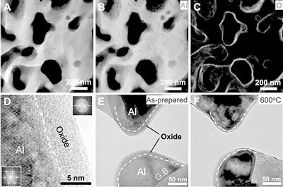 中科院金屬所沈陽(yáng)材料科學(xué)國(guó)家研究中心金海軍研究團(tuán)隊(duì)將脫合金腐蝕與置換反應(yīng)(GRR)相結(jié)合,成功制備出無(wú)裂紋的高質(zhì)量納米多孔鋁樣品。其孔棱直徑約為200納米,且孔棱表面覆蓋有自發(fā)生成且可自修復(fù)的氧化鋁納米殼層(如圖)。該納米氧化膜不僅阻止材料進(jìn)一步氧化和自燃,而且,大幅降低表面擴(kuò)散速率,從而提高納米多孔鋁的熱穩(wěn)定性。該材料納米多孔結(jié)構(gòu)在接近鋁熔點(diǎn)溫度下仍能保持穩(wěn)定而不發(fā)生顯著結(jié)構(gòu)粗化。由于該材料較好的多孔結(jié)構(gòu)聯(lián)結(jié)性和優(yōu)異的承載效率,以及表面氧化膜的強(qiáng)化作用,納米多孔鋁在拉伸和壓縮條件下均表現(xiàn)出高強(qiáng)度。其強(qiáng)度遠(yuǎn)高于同等密度傳統(tǒng)泡沫金屬材料。與已報(bào)道的納米多孔金屬相比,納米多孔鋁不僅更穩(wěn)定,而且密度更低,比強(qiáng)度更高。該研究不僅為發(fā)展新型輕質(zhì)高強(qiáng)度新材料提供新思路,也為探索高溫等極限條件下納米多孔金屬功能應(yīng)用提供契機(jī)。