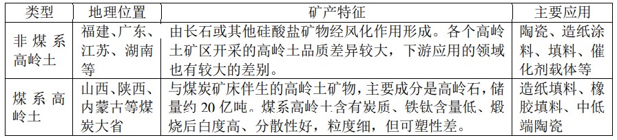 我國高嶺土主要可分成煤系高嶺土和非煤系高嶺土,主要區(qū)別、地理位置、礦產(chǎn)特征與主要應(yīng)用列示如下: