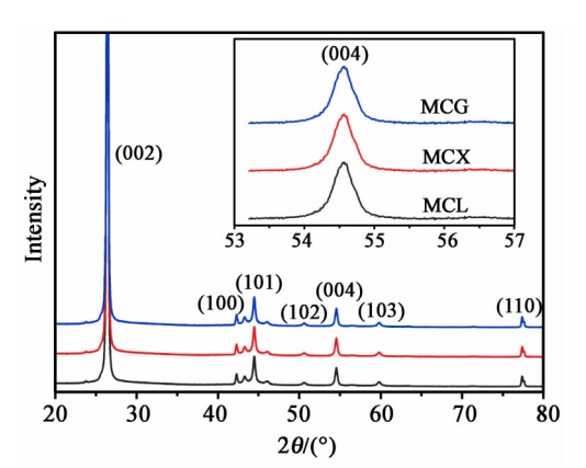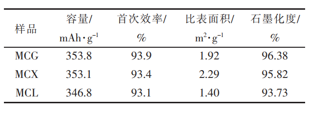 研究者以油系針狀焦粉為原料,通過表面改性預(yù)處理,來制備人造石墨。分別在坩堝爐、箱體爐以及連續(xù)式石墨化爐中對針狀焦粉進(jìn)行石墨化,取得三種樣品,并記作MCG(坩堝爐樣品)、MCX(箱體爐樣品)、MCL(連續(xù)式石墨化爐樣品)。之后,對三種樣品分別進(jìn)行石墨化度測試、比表面積測試、容量和效率測試,并從石墨化度、容量、比表面積、石墨化均勻性四個角度做對比分析。