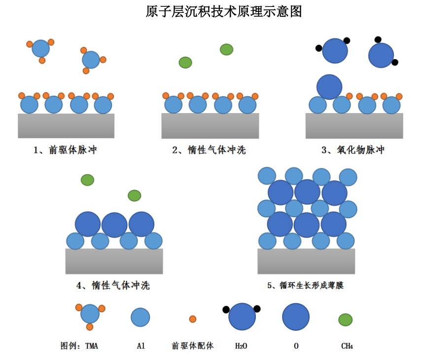ALD技術(shù)是一種特殊的真空薄膜沉積方法,具有較高的技術(shù)壁壘。通過ALD鍍膜設(shè)備可以將物質(zhì)以單原子層的形式一層一層沉積在基底表面,每鍍膜一次/層為一個(gè)原子層,根據(jù)原子特性,鍍膜10次/層約為1nm。由于ALD技術(shù)表面化學(xué)反應(yīng)具有自限性,因此擁有多項(xiàng)獨(dú)特的薄膜沉積特性:(1)三維共形性,廣泛適用于不同形狀的基底;(2)大面積成膜的均勻性,且致密、無針孔;(3)可實(shí)現(xiàn)亞納米級的薄膜厚度控制。