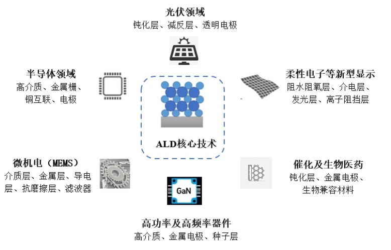基于上述特性,ALD技術(shù)廣泛適用于不同場景下的薄膜沉積,在光伏、半導(dǎo)體、柔性電子等新型顯示、MEMS、催化及光學(xué)器件等諸多高精尖領(lǐng)域均擁有良好的產(chǎn)業(yè)化前景。