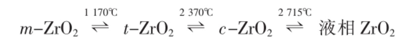 ZrO2具有多晶型的相結(jié)構(gòu),低溫為單斜晶系(m-ZrO2),高溫為四方晶系(t-ZrO2),更高溫度下為立方晶系(c-ZrO2),3種晶型相互間的轉(zhuǎn)化關(guān)系如下: