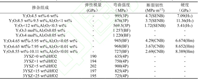 在采用釔作為摻雜元素時,Y2O3的摻雜量常采用3mol%、5mol%、8mol%,且隨著Y2O3含量增加,穩(wěn)定氧化鋯陶瓷可從四方相(部分穩(wěn)定)轉(zhuǎn)換為立方相(全穩(wěn)定),可應(yīng)用于不同領(lǐng)域。不同Y2O3含量的穩(wěn)定氧化鋯的力學(xué)性能具有一定的差異性。與其他穩(wěn)定劑相比,Y2O3燒結(jié)溫度低、材料燒結(jié)性能好、致密度高。釔穩(wěn)定氧化鋯具有優(yōu)良的力學(xué)性能、化學(xué)穩(wěn)定性及良好的離子導(dǎo)電性。
