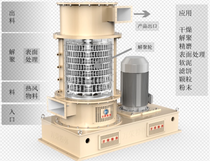 1.物料粉體被干燥降低含水量到5‱以內(nèi),160米/秒線速度剪切力將粉體解聚粉碎還原到原始粒徑;