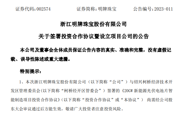 中國粉體網(wǎng)訊 3月12日,明牌珠寶(002574)發(fā)布公告,公司與柯橋經(jīng)開區(qū)管委會(huì)為加快推進(jìn)區(qū)域經(jīng)濟(jì)高質(zhì)量發(fā)展,雙方本著互惠互利、共謀發(fā)展的原則,就公司投資建設(shè) 20GW 新能源光伏電池片智能制造項(xiàng)目的相關(guān)事宜,簽署了《20GW 新能源光伏電池片智能制造項(xiàng)目投資合作協(xié)議》。