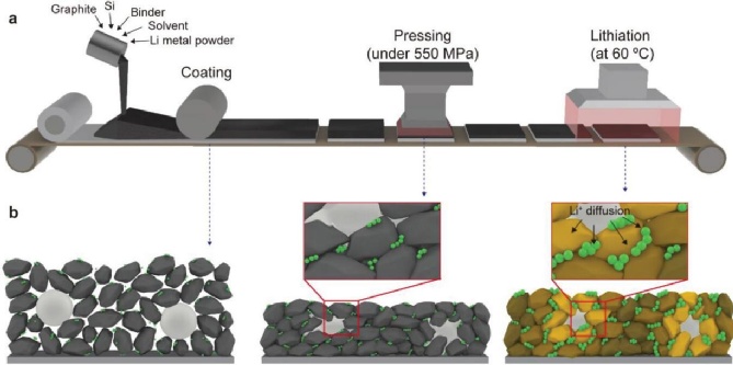 全固態(tài)電池(ASSBs)被認為是克服與鋰離子電池相關的普遍問題(如安全性和能量密度)的有效解決方案,然而實現(xiàn)與傳統(tǒng)LiBs性能相當或更優(yōu)的ASSBs,必須解決多個關鍵問題,如提高固體電解質的離子/電子電導率、電化學穩(wěn)定性窗口、優(yōu)化電極設計、以及降低界面電阻等。圍繞以上挑戰(zhàn),研究者提出了復合電極、擴散相關電極(DDEs)等方案,其中Gr/Si電極是高性能ASSBs的有希望的候選者,但是硅的高體積膨脹(400%)導致硅顆粒破裂、電極膨脹、SEI破壞、較低的CE和快速的容量衰減。預鋰化是緩解Si相關問題的有效策略,而且DDEs具有簡單的結構易于制造,因此將預鋰化方法引入DDEs是可行的。