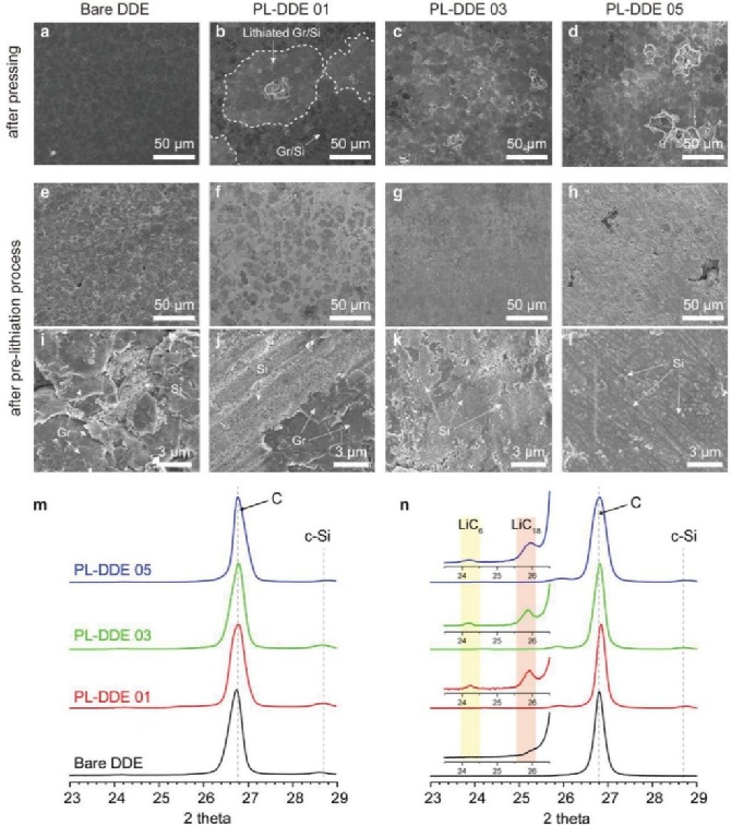 圖2.每個DDE后的SEM:(a-d)壓制后,(e-l)預鋰化過程后。不同量Li金屬粉末DDEs的XRD:(m)預鋰化之前,(n)預鋰化之后。