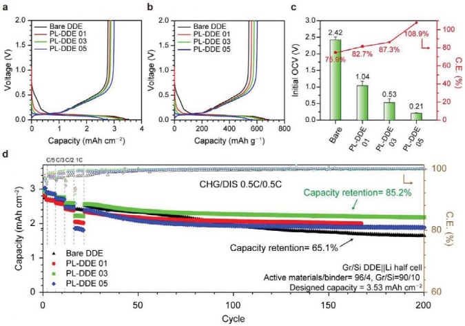 圖3.DDEs的Gr/Si||Li半電池:(a)面積容量的首次充放電曲線,(b)比容量的首次充放電曲線,(c)初始開路電壓和CEs,(d)倍率性能和循環(huán)性能曲線。