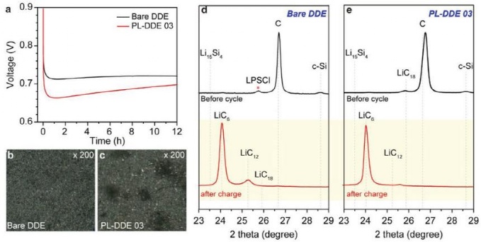 為了解釋PL-DDE03性能的顯著提高,通過監(jiān)測OCV研究第一次循環(huán)后鋰化狀態(tài)的變化。如圖4a為在第一次循環(huán)后12h內的OCV曲線,在電池完全充電后,DDE的OCV立即降到0.72V。而PL-DDE03的OCV最初降至0.66V,然后持續(xù)增加至0.70V,表明PL-DDE03內殘余的Li被鋰化成活性材料。在第一次循環(huán)后,如圖4b、c所示,PL-DDE03的光學圖像中仍能看到Li的閃亮顆粒,其可能參與隨后的鋰化反應。完全鋰化后的XRD進一步證實了PL-DDE03中殘余鋰的作用,完全鋰化的石墨和硅從C和c-Si到LiC6和Li15Si4的相變。然而DDE中石墨鋰化相關的顯示出弱的LiC12峰,表明石墨具有較低的鋰化狀態(tài)(如圖4d)。此外,在DDE中沒有Li15Si4的相位,表明基于擴散的鋰離子傳輸不能利用所有的活性材料。相比之下,PL-DDE03完全鋰化石墨形成LiC6(如圖4e),其中Li的存在為活性材料提供了Li源,并在循環(huán)過程中誘導整個DDE的均勻鋰化。
