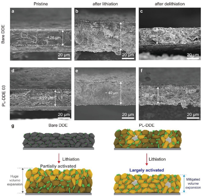 圖5.(a-c)DDE和(d-f)PL-DDE03在壓制、鋰化和去鋰化后的橫截面SEM,(g)DDE和PL-DDE03的鋰化行為示意圖。