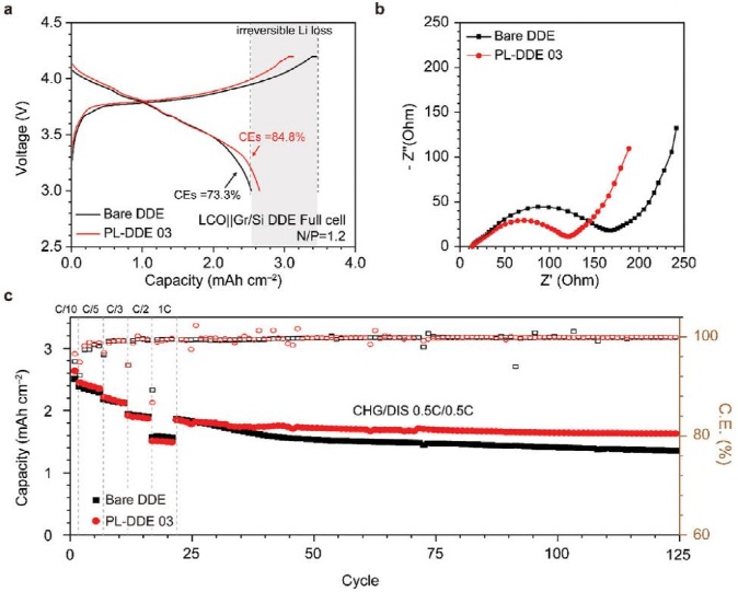 圖6.(a)DDE和PL-DDE03全電池的第一次充放電曲線,(b)DDE和PL-DDE03電池在初始充放電循環(huán)后的EIS,(c)DDE和PL-DDE03電池的倍率性能和循環(huán)性能。