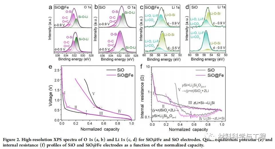 圖2SiO@Fe和SiO電極的高分辨率XPS光譜、準(zhǔn)平衡電位和內(nèi)阻
