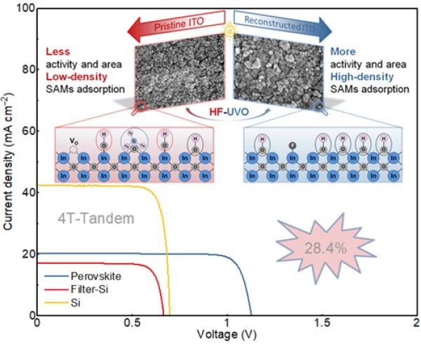 近期,中國科學(xué)院寧波材料技術(shù)與工程研究所研究員葉繼春帶領(lǐng)硅基太陽能及寬禁帶半導(dǎo)體團隊,在前期晶體硅和鈣鈦礦太陽電池研究的基礎(chǔ)上,在鈣鈦礦/硅疊層電池方向取得了新進展。該團隊提出了ITO表面重構(gòu)的新方法,實現(xiàn)了效率為28.4%的四端鈣鈦礦/硅疊層太陽電池的制備。該工作通過氫氟酸和隨后的紫外臭氧處理方法選擇性地去除ITO表面不需要的末端羥基和水解產(chǎn)物,從而實現(xiàn)ITO表面重構(gòu)。這種方法可增加ITO表面活性和面積,從而促進高密度SAMs的吸附。此外,所得的氟化表面還可以防止ITO與鈣鈦礦活性層的直接接觸,并鈍化鈣鈦礦的埋底界面。得益于協(xié)同改進的鈣鈦礦成膜、電荷提取、能級排列和界面化學(xué)穩(wěn)定性,相應(yīng)的單結(jié)鈣鈦礦太陽電池獲得了21.3%的光電轉(zhuǎn)換效率和較好的長期運行穩(wěn)定性?蒲腥藛T將由重構(gòu)的ITO制得的半透明電池和遂穿氧鈍化接觸(TOPCon)電池用于四端鈣鈦礦/硅疊層太陽電池的制備,最終獲得了28.4%的效率。