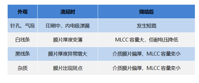 電極肥大、重影、電極滲開:電極肥大或重影,會造成圖形尺寸偏大,電極有效面積越大,對應(yīng)的容量越大,但是可靠性會降低。電極滲開是印刷圖形邊緣存在類似水印的現(xiàn)象,會造成容量分散,容量命中率變差。