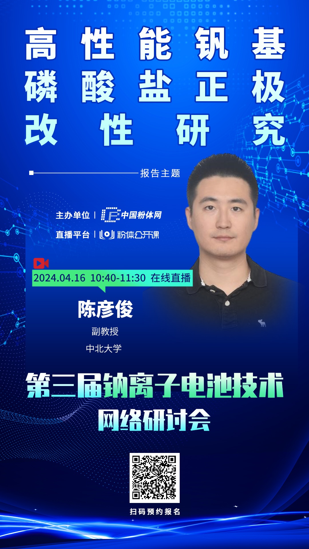 粉體公開(kāi)課將于4月16號(hào)組織召開(kāi)第三屆鈉離子電池技術(shù)網(wǎng)絡(luò)研討會(huì),共同探討最新產(chǎn)業(yè)技術(shù)發(fā)展動(dòng)態(tài)。特邀中北大學(xué)陳彥俊副教授帶來(lái):高性能釩基磷酸鹽正極改性研究