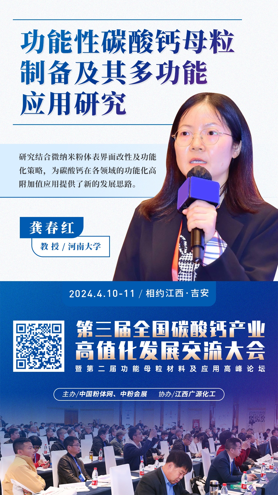 2024年4月10日~11日,第三屆全國(guó)碳酸鈣產(chǎn)業(yè)高值化發(fā)展交流大會(huì)將在江西·吉安舉行,屆時(shí)河南大學(xué)龔春紅教授將在大會(huì)上作《功能性碳酸鈣母粒制備及其多功能應(yīng)用研究》主題報(bào)告,分享塑料母粒行業(yè)發(fā)展現(xiàn)狀,分析碳酸鈣功能母粒的制備及其應(yīng)用技術(shù)。