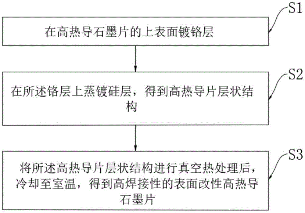 本發(fā)明提供的表面改性高熱導(dǎo)石墨片,通過(guò)在高熱導(dǎo)石墨片表面依次鍍鉻層和硅層,解決了金屬鋁不能對(duì)高熱導(dǎo)石墨進(jìn)行有效潤(rùn)濕而影響金屬鋁與高熱導(dǎo)石墨焊接結(jié)合強(qiáng)度的問(wèn)題,還能有效降低金屬鋁與高熱導(dǎo)石墨焊接時(shí)焊接界面開裂的風(fēng)險(xiǎn)。