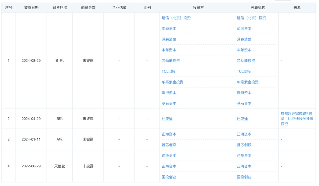 2024年,公司一年進行了A輪、B輪、B+輪三輪融資,正海資本、鑫芯創(chuàng)投、比亞迪、基石資本、沃衍資本、華泰紫金投資、TCL創(chuàng)投、芯動能投資、豐年資本、澤森清泉、尚頎資本、建信(北京)投資等投資方參與其中。其中,比亞迪獨家投資了公司的B輪融資。