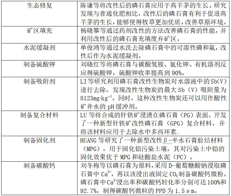磷石膏通常用作土壤改良劑,其中含有的酸性物質(zhì)可以提高土壤pH,解決土壤鹽堿化問題,此外磷石膏中的Ca、P、S和Na等物質(zhì),滿足植物生長所需的營養(yǎng)物質(zhì),可以改善土壤結(jié)構(gòu)、增加土壤肥力、提高作物產(chǎn)量。除去雜質(zhì)后的磷石膏可用于石膏建材、路基材料、制硫酸聯(lián)產(chǎn)水泥等多個領(lǐng)域。磷石膏經(jīng)除雜凈化處理后,在通過轉(zhuǎn)晶可制備β-半水石膏、無水Ⅱ型石膏和α-半水石膏建材粉體材料。磷石膏經(jīng)預處理后去除其中的可溶性P2O5,凈化后的磷石膏可用于制備硫酸聯(lián)產(chǎn)水泥。磷石膏中的主要成分硫酸鈣可制成碳酸鈣和硫酸鈣晶須,晶須的高強度、高韌性等優(yōu)點,可廣泛用于涂料、橡膠等領(lǐng)域。